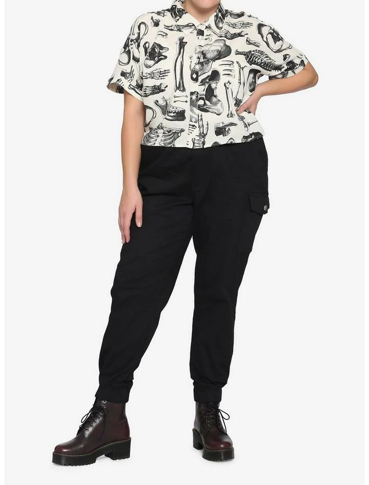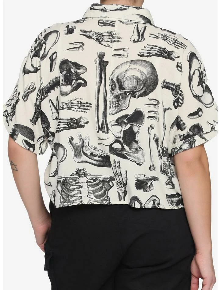If your wardrobe is looking a little bare bones, add this boxy button-up! Sepia-toned, collared button-up crop top features an allover print of anatomical skeleton images.