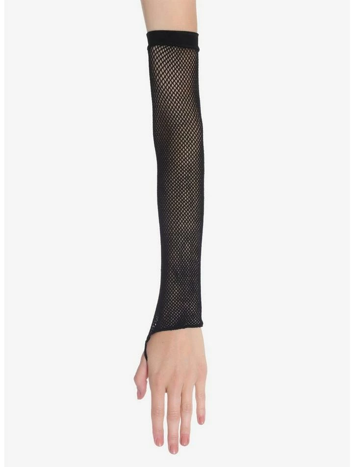 Fishnet isn’t just for tights. Make a statement with these black fishnet arm warmers. They have an attached elastic ring and cover the forearms.