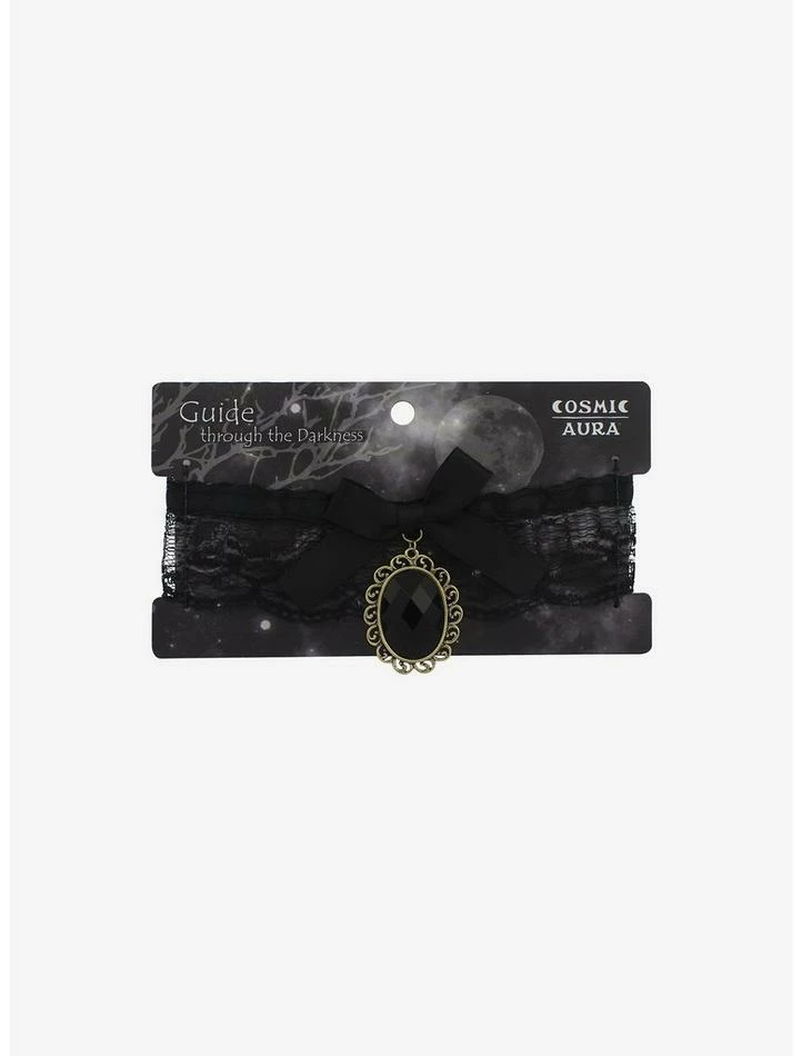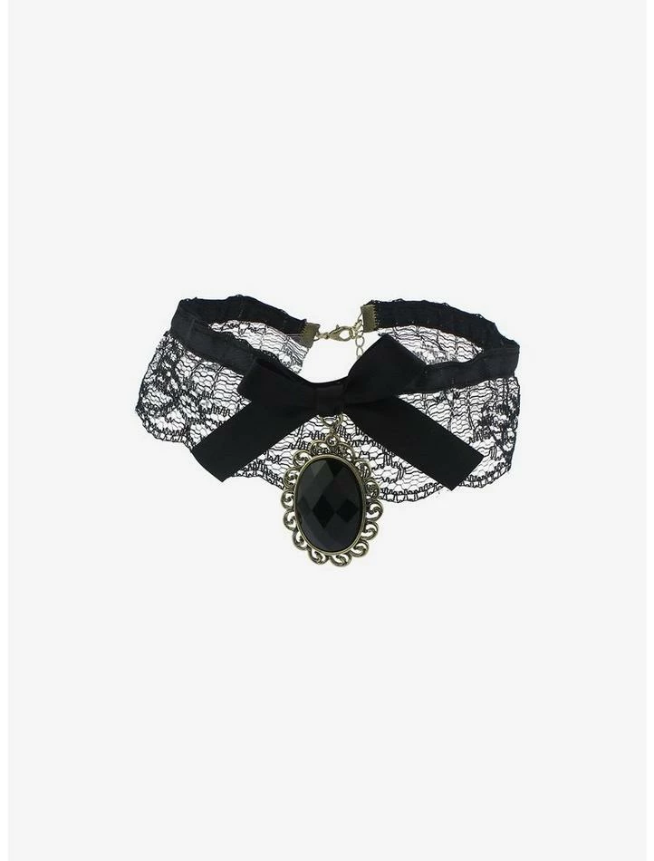 Every vamp girl needs her statement piece! This ornate choker is perfect for bringing all the gothic vibes to your look. It features a black lace trim, a dainty bow in the center, plus a black faux gem stone to finish off the look.