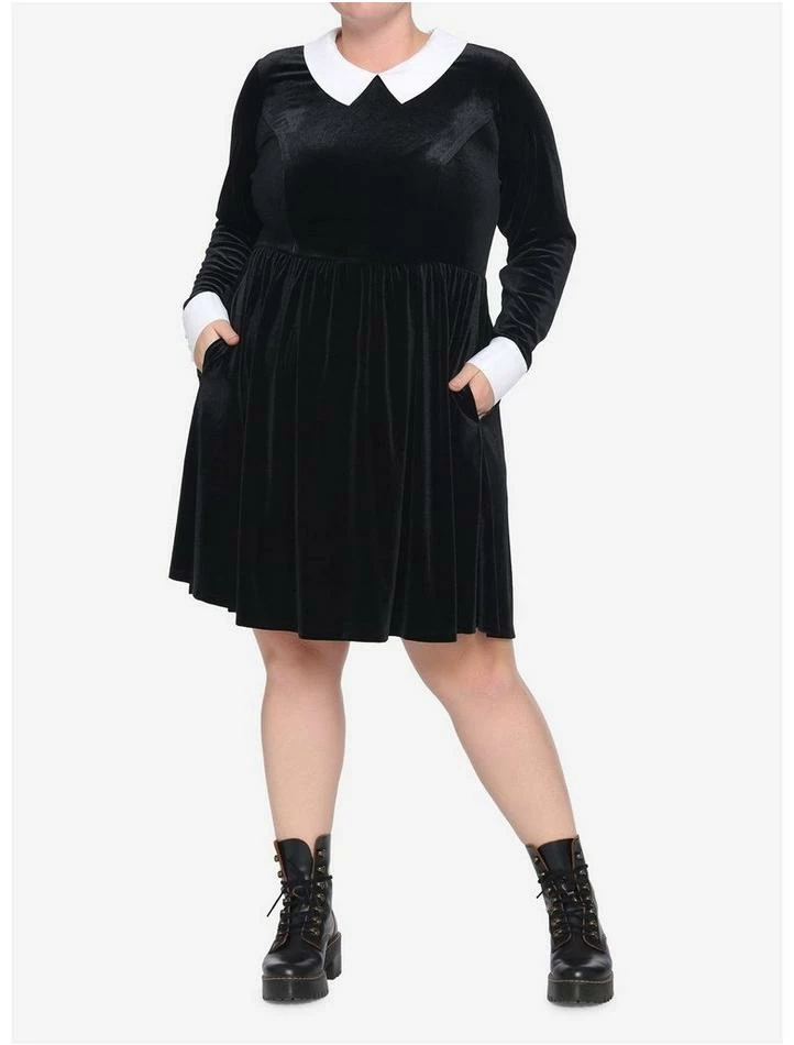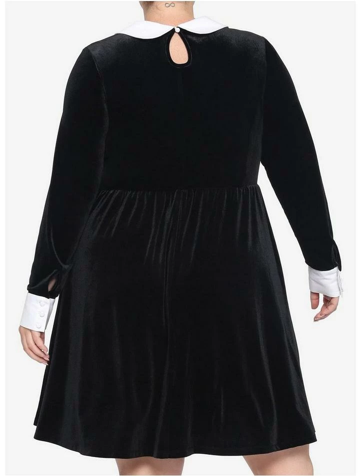 Black velvet dress with contrasting white collar, long sleeves with white cuffs, back single cloth button closure and pockets. Throw on your knee-high socks and saddle shoes and you’re ready to go!