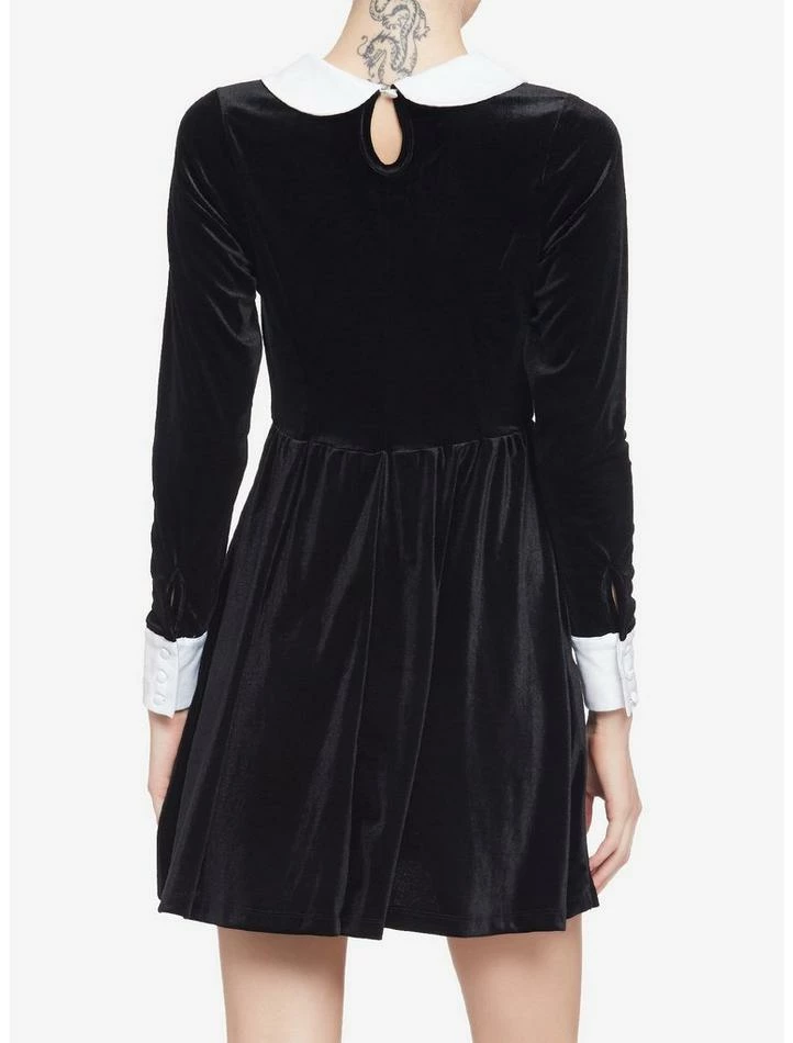 Black velvet dress with contrasting white collar, long sleeves with white cuffs, back single cloth button closure and pockets. Throw on your knee-high socks and saddle shoes and you’re ready to go!
