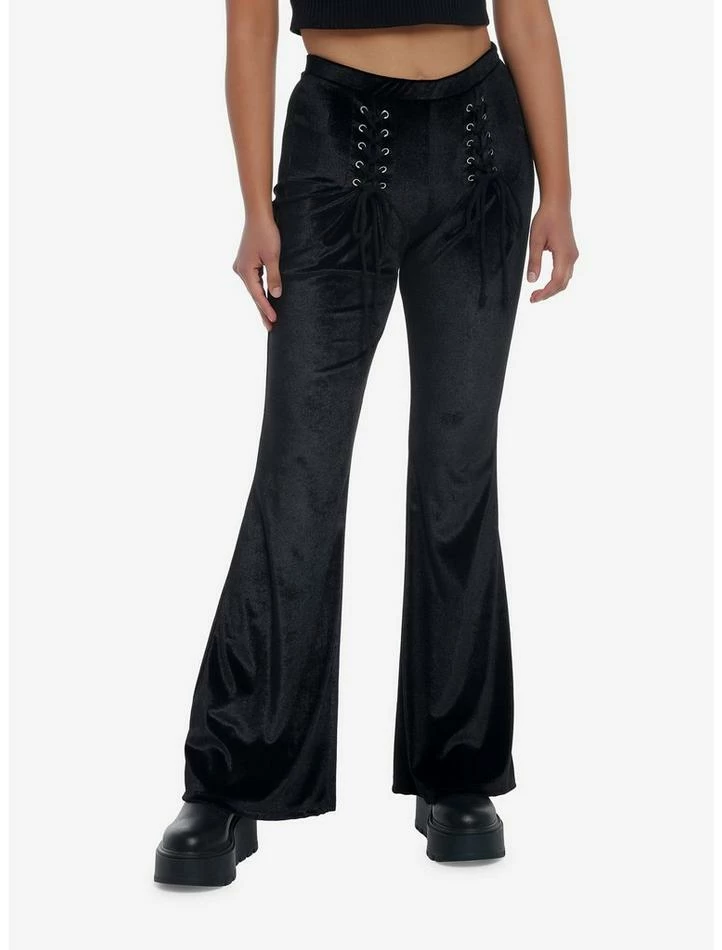 Move over, straight legs! Flares are comin’ for ya. Try these comfy flare pants in black velvet; they have lace-up detail on the hips.