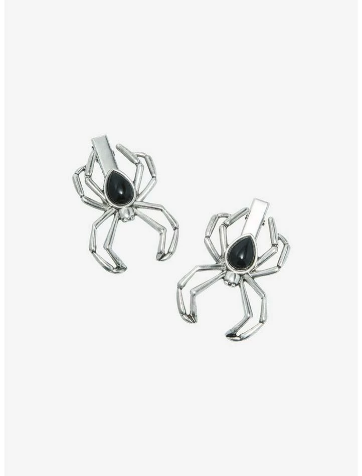 Get caught in a web of fashion with these spider hair clips! These arachnids are here to help spin out the perfect hairstyle to complete your look. This hair clip set features 2 silver-tone spiders with black gem centers.