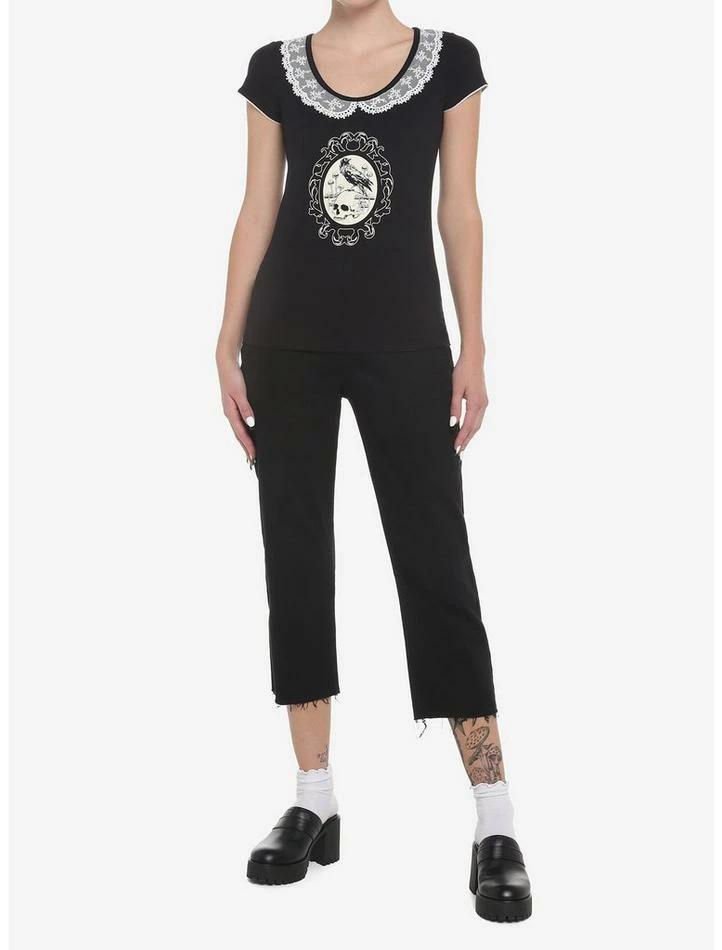 Feelin’ weak and weary on a midnight dreary? Then throw on this top to match your mood! This tee has a fitted silhouette and features a delicate, white lace collar and a framed graphic of a raven perched upon a skull.