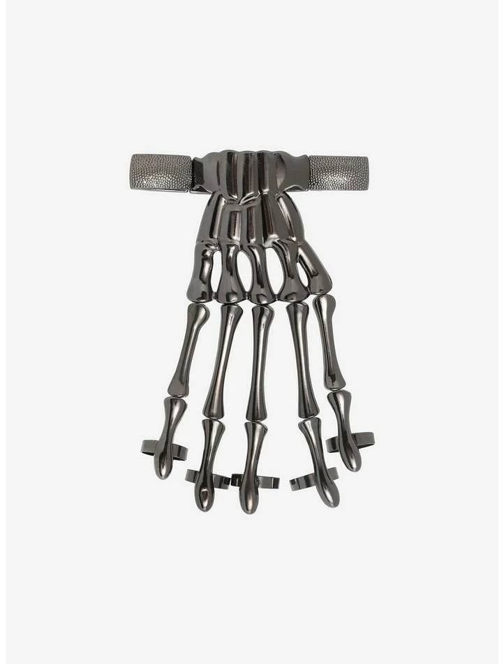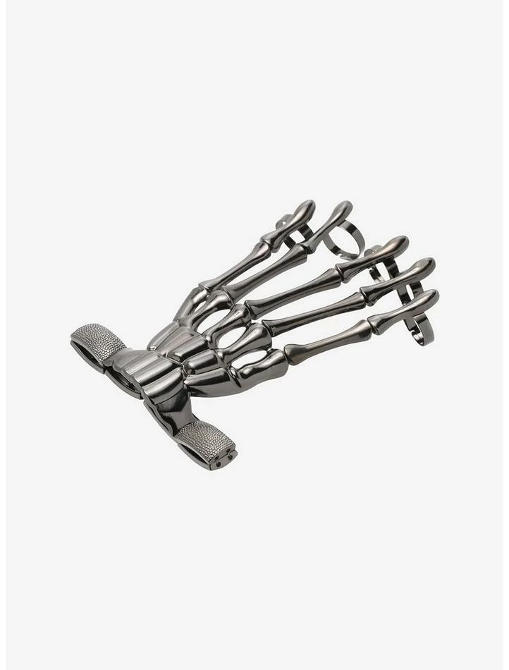 This skeleton hand wraps around your wrist and each finger has a ring. Stretches to fit your hand.